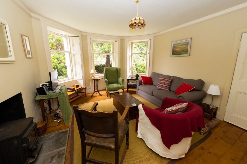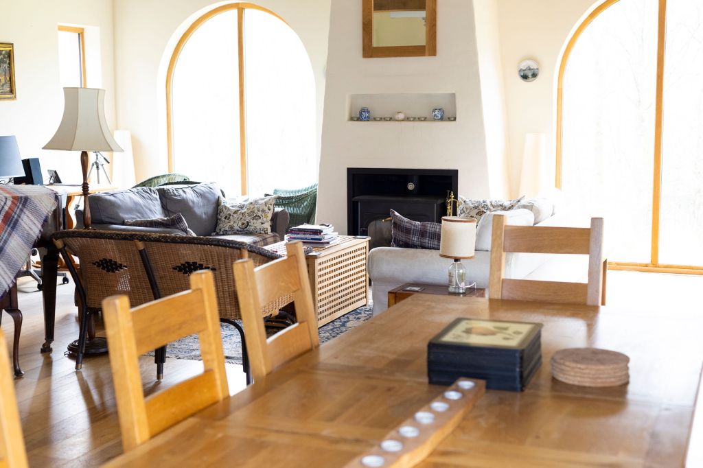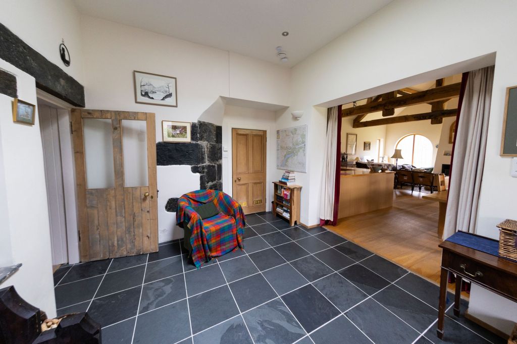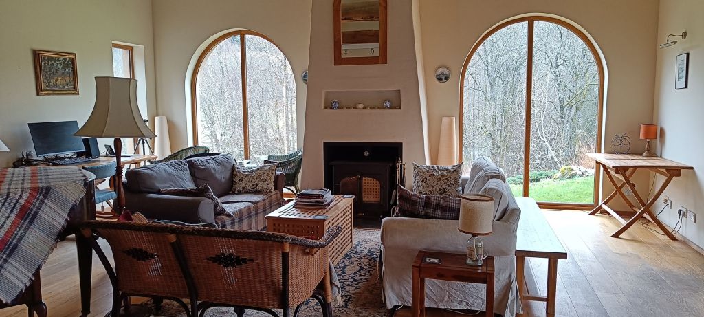 A major 2007 extension houses a large, bright family room with striking green oak beams. This bright open plan room includes a dining area, a sitting area with a wood burning stove, and a fully fitted kitchen with an Aga, dishwasher and fridge. French windows lead out to a veranda overlooking the garden towards the mountains to the west and a terrace above the River Lyon to the south and east. Perfect for wildlife watching, a sun-downer and outdoor entertaining.